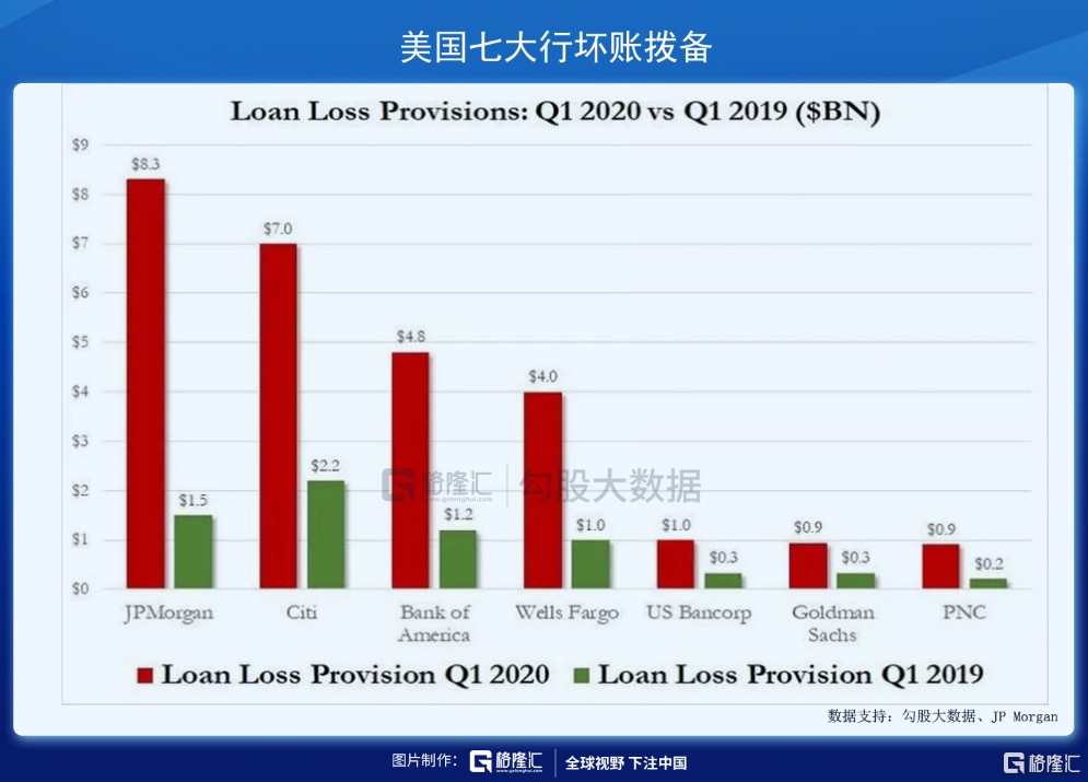 今年一季度,由于担心疫情发展和经济停摆带来的坏账猛增,包括摩根大通、摩根士丹利、花旗、高盛等在内的全美七大银行的坏账拨备达到了270亿美元,比去年同期多四倍。