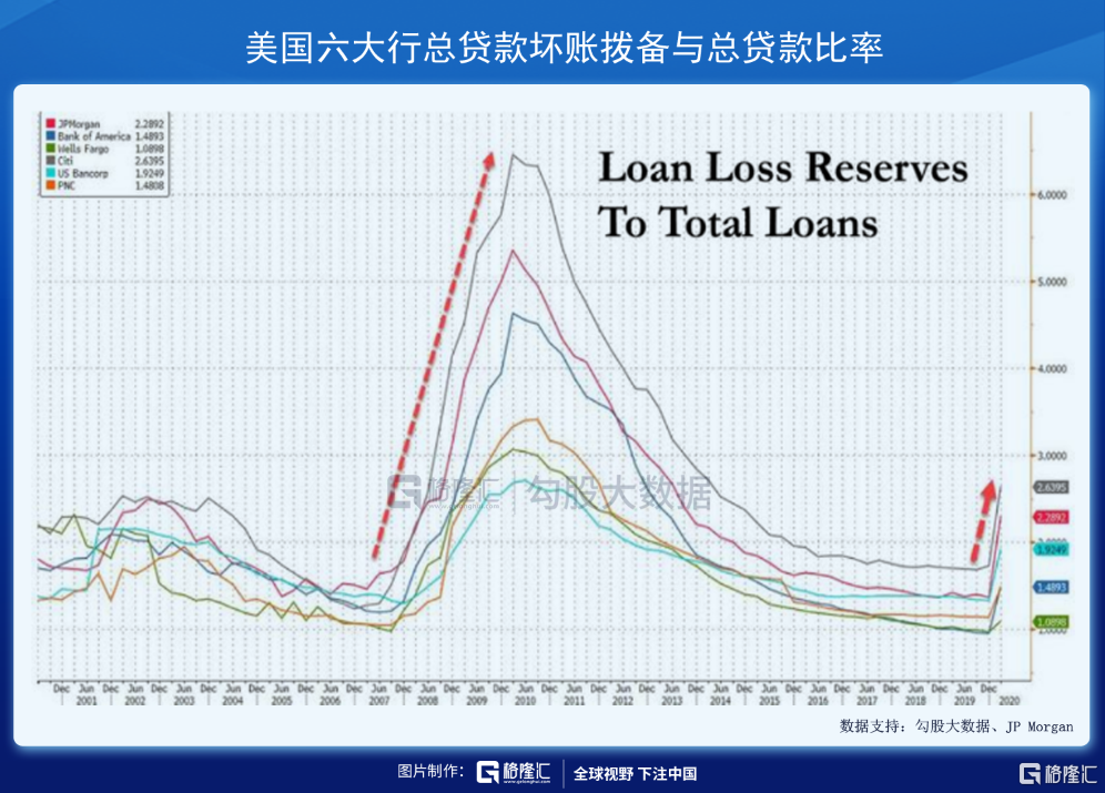 美国在次贷危机期间,总贷款坏账拨备与总贷款比率飙升至4%至6%,而目前在1.5%到2.5%之间。也就意味着,如果新冠肺炎带来的经济不确定性一直存在,美国银行业的坏账拨备还要提升。
