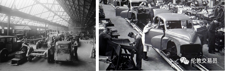 左图: 传统汽车组装工厂;右图: 福特流水线汽车组转工厂