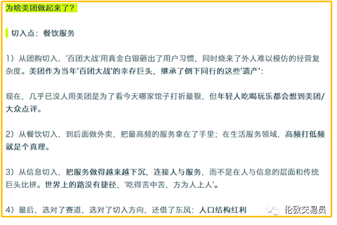 其实很早以前伦敦交易员在里说过,美团成功的原因之一就是从信息切人,让人和服务直接连接,而不是和信息直接连接。用户从美团真正需要的,不是哪个商家有促销活动(信息),而是促销商品本身(服务)。