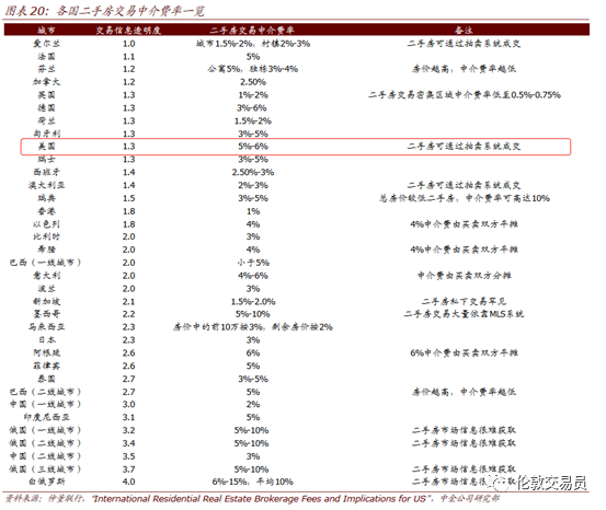 美国的房屋卖方市场率先完成了经纪人的职业化改造。MLS累积的房源信息为卖方经纪人提供了谈判的筹码,而且这个筹码在越垒越高,最终为他们提供了高达5%的佣金水平(见下表),超过了大部分的全球同行。