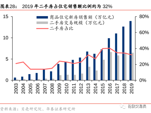 二手房市场的交易规模从2016年就开始下滑,二手房占住宅销售额比例也从40%降到了32%。