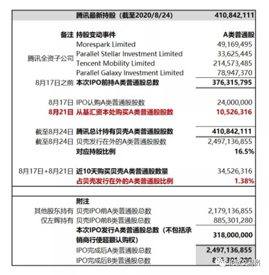 因此,对于有"远见"的创业者,也需要有"远见"的投资者。腾讯作为贝壳的二股东,曾被左老板夸赞,"只帮忙不添乱"。这即是腾讯投资在业内广受欢迎的原因,也是贝壳能坚持下来的原因之一。甚至在上市之后,腾讯还继续加仓,见下图。