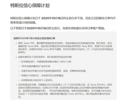 因为特斯拉中国官网悄悄更新了“购车保障计划”,2020年10月16日之后,买家(所有车型)再也不能在提车后7天无理由退款了。