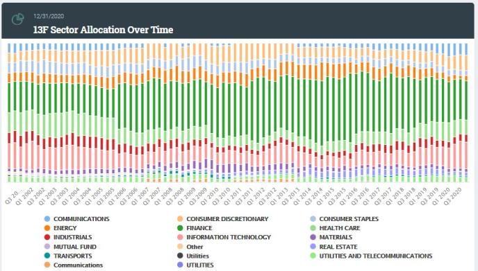 从持仓偏好来看,自2002年以来,金融类、IT、及医疗保健标的在大多时期都占花旗集团仓位重头。