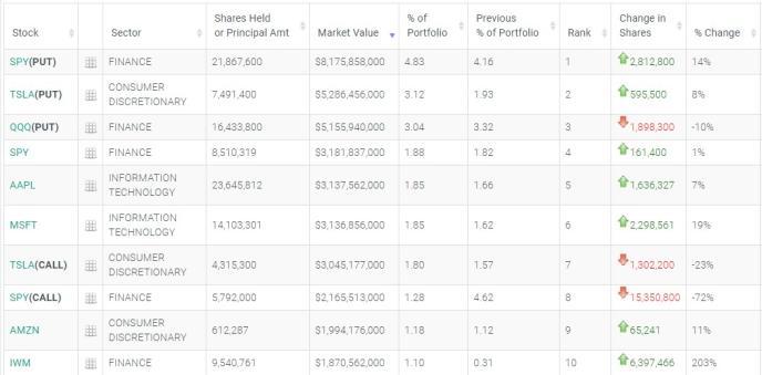 在前五大重仓股中,标普500指数(PUT)位列第一,持仓21,867,600股,持仓市值8,175,858,000美元,较上季度持仓数量增长了14%,占投资组合比例为4.83%。特斯拉(TSLA.US)PUT位列第二,持仓7,491,400股,持仓市值约5,286,456,000美元,占投资组合比例为3.12%。纳指100ETF(PUT)位列第三,持仓约16,433,800股,持仓市值5,155,940,000美元,占投资组合比例为3.04%。