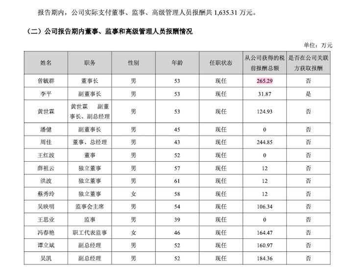 此外,时代财经留意到,报告期内,宁德时代实际支付董事、监事、高级管理人员报酬共1635.31万元。其中,董事长曾毓群从该公司获得的税前报酬总额为265.29万元。