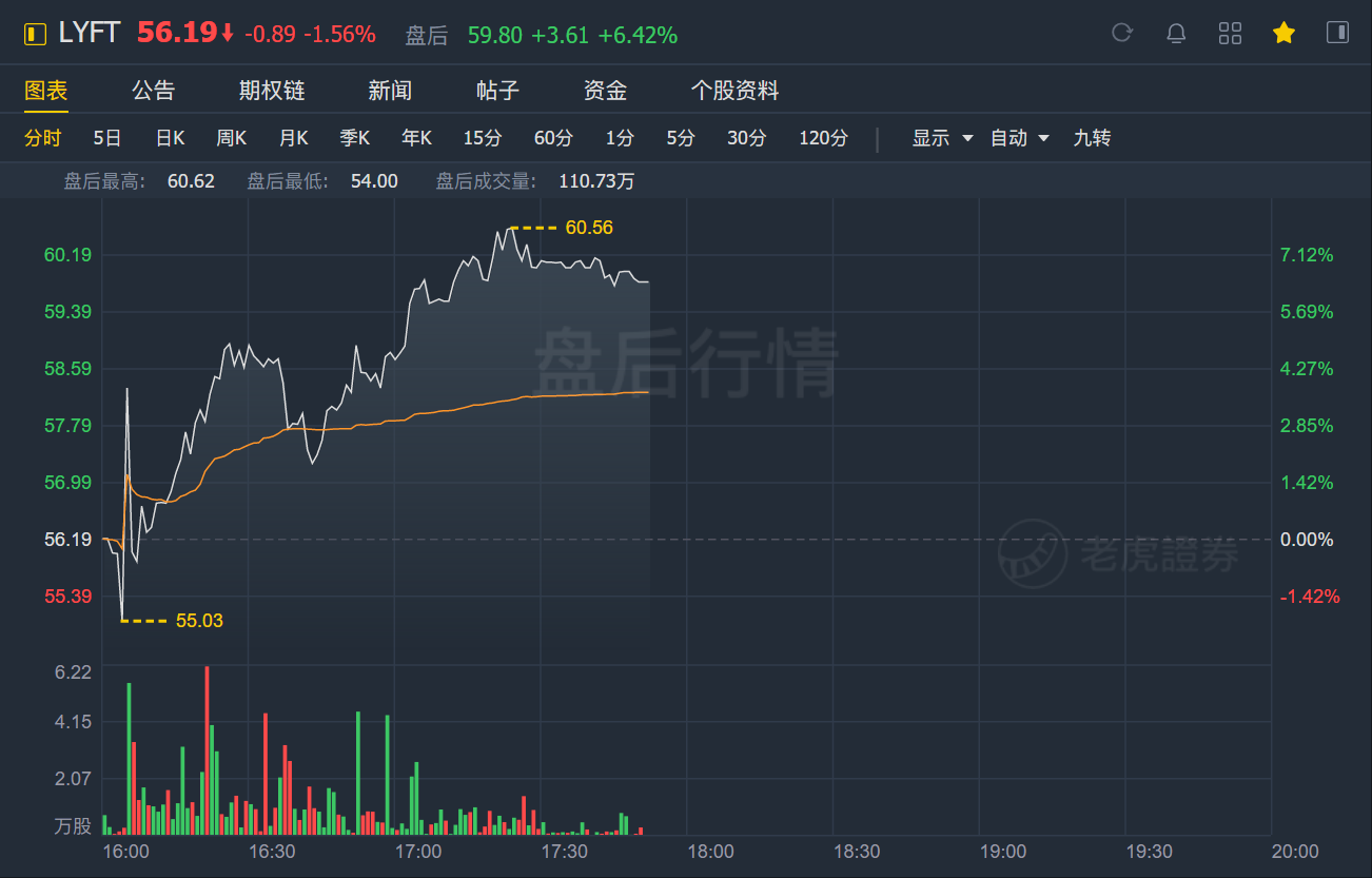 财报公布后,Lyft股价盘后涨超6%,该公司股价周二收跌1.56%,报56.19美元。