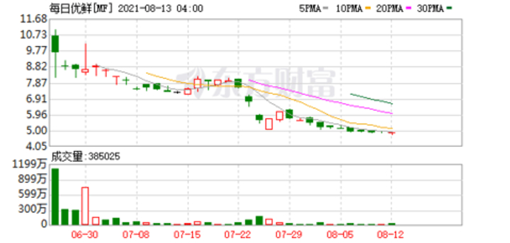 事实证明,每日优鲜上市后,表现一直处于低迷状态。7月15日,上市仅14个交易日的每日优鲜,股价跌至7.14美元,较发行价折价45%。8月12日,每日优鲜股价跌至4.89美元,与发行价相比大跌62%。