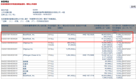 2021年8月12日,药明康德H股遭贝莱德在场内以每股均价162.5525港元减持好仓37.28万股,涉资约6059.9万港元。减持后,贝莱德最新持好仓数目为46,603,824股,持仓H股比例由12.08%下降至11.98%。