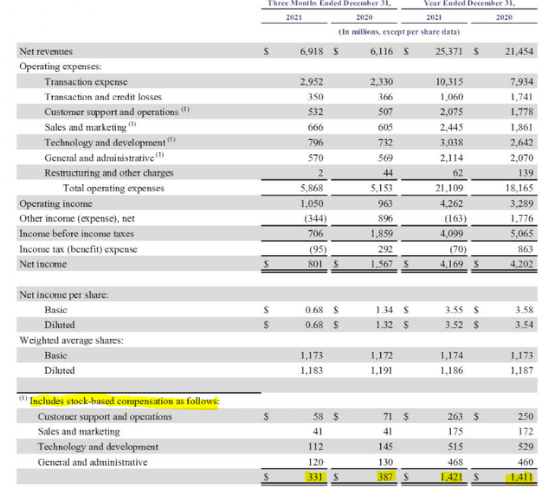 基于股票的报酬(PayPal 2021年第四季度简报)