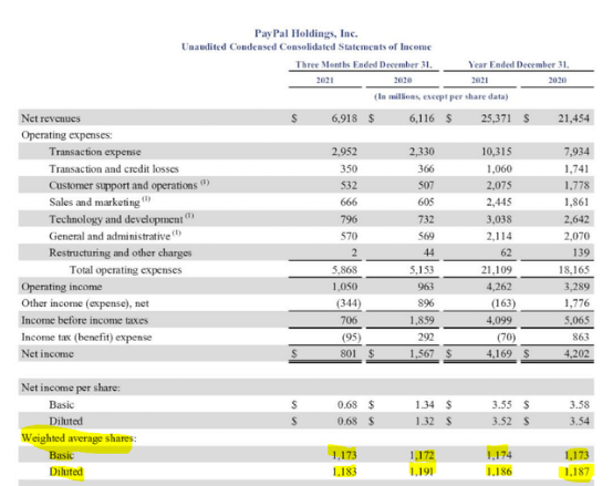 PayPal股份计数(PayPal 2021年第四季度报告)