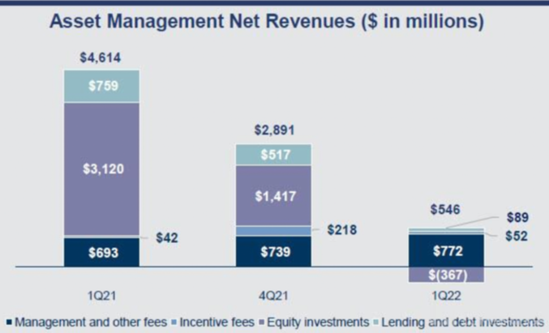 受此影响,高盛的资管部门一季度的净收入大跌88%,仅剩5.46亿美元,而在一年前,高盛资管部门的净收入高达46亿美元。