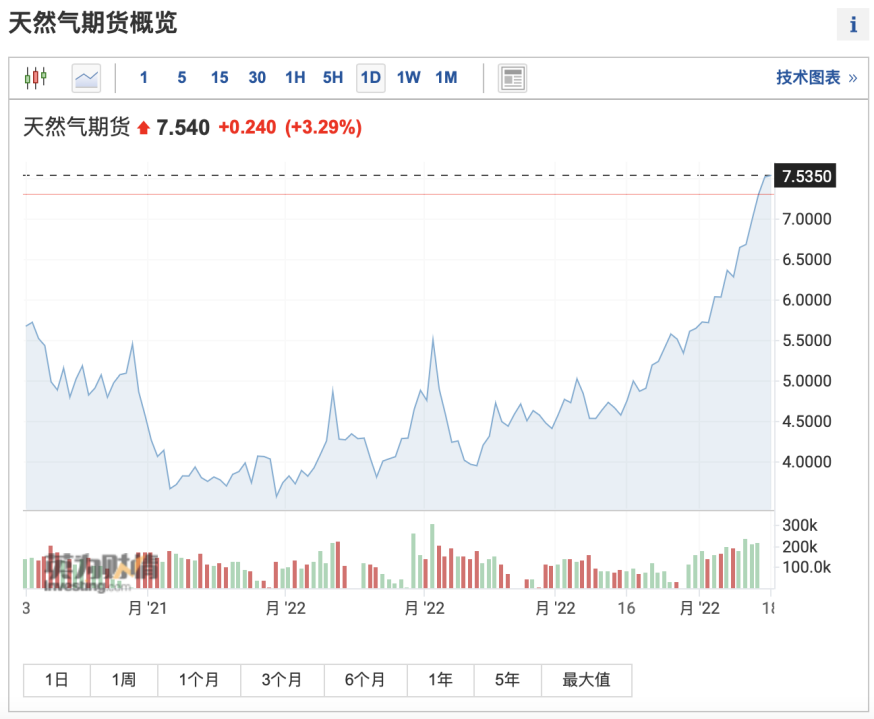 4月18日,美国天然气期货价格升至7.55美元/百万英热,突破1月的高点,较年初价格上涨了约一倍,即创逾十三年来的最高水平。