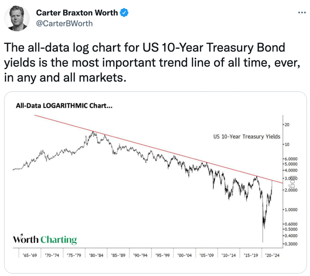 Worthcharting公司的技术分析师CarterBraxtonWorth表示,如果10年期美国国债收益率突破其40年的下行趋势,可能被视为一个新的上行趋势的开始。这将意味着利率将持续上升,美国股市将持续承压。