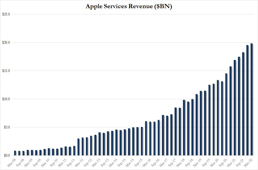 一季度包括Apple TV+、Apple Arcade、Apple Music和iCloud订阅在内的服务业务录得收入198.21亿美元,连续五个季度创新高,分析师预期197.8亿美元。