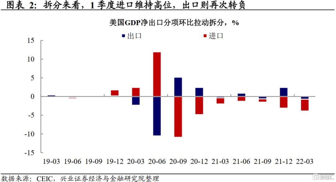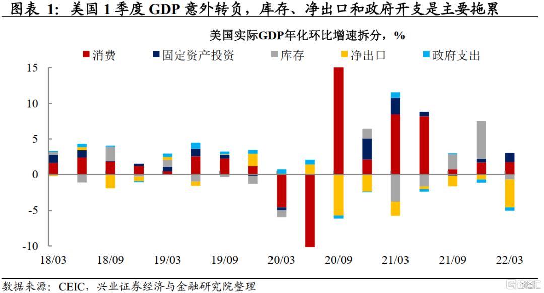 美国1季度GDP意外转负,库存、净出口和政府开支是主要拖累。