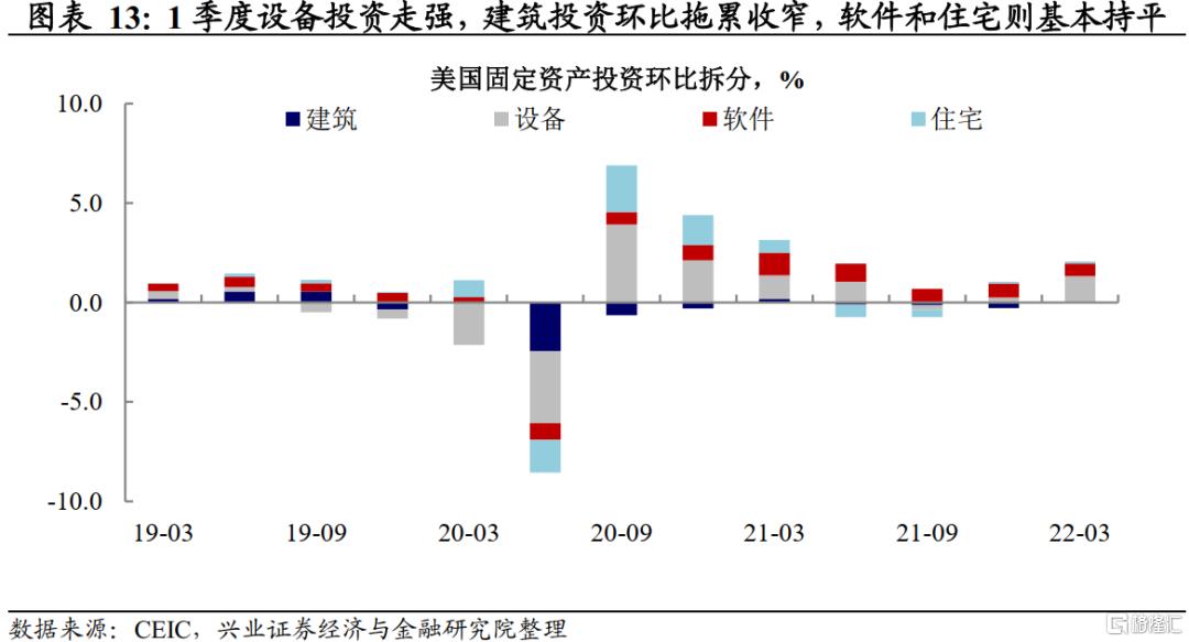 1季度设备投资走强,建筑投资环比拖累收窄,软件和住宅则基本持平。拆分来看,1季度非住宅投资环比拉动从0.6%升至1.8%,其中设备投资环比拉动从0.3%升至1.3%,建筑投资环比拖累从-0.3%收窄至0%,软件投资拉动则由0.7%消费回落至0.6%;住宅投资环比拉动则维持在0.1%