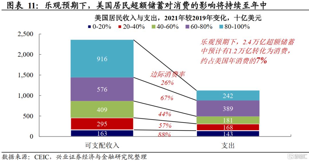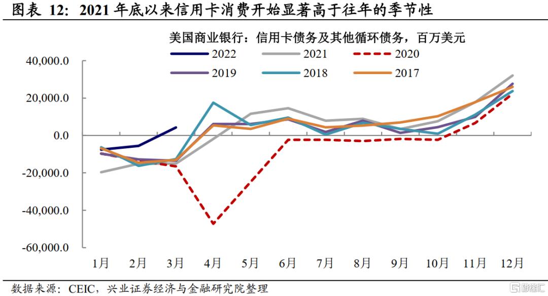 伴随着超额储蓄逐步消耗,居民消费下半年的逆风可能将更加明显。本财政刺激导致美国居民收入大幅高于疫情前水平,美国居民增加超额储蓄约2.4万亿美元。考虑不同收入群体的消费偏好不同,其中约有1.2万亿美元能被用于消费,约占美国年消费额的7%,我们估算下来,超额储蓄对消费的影响可能将持续到年中。一个可以观测超额储蓄消耗的数据是美国居民的信用卡消费,居民信用卡消费额自2021年年底以来,开始显著超过以往的季节性,这说明虽然有的人花钱快、有的人花钱慢,但是居民口袋里的钱正在逐步消耗,而当这部分财政“余韵”消失,消费的下行压力将进一步凸显。