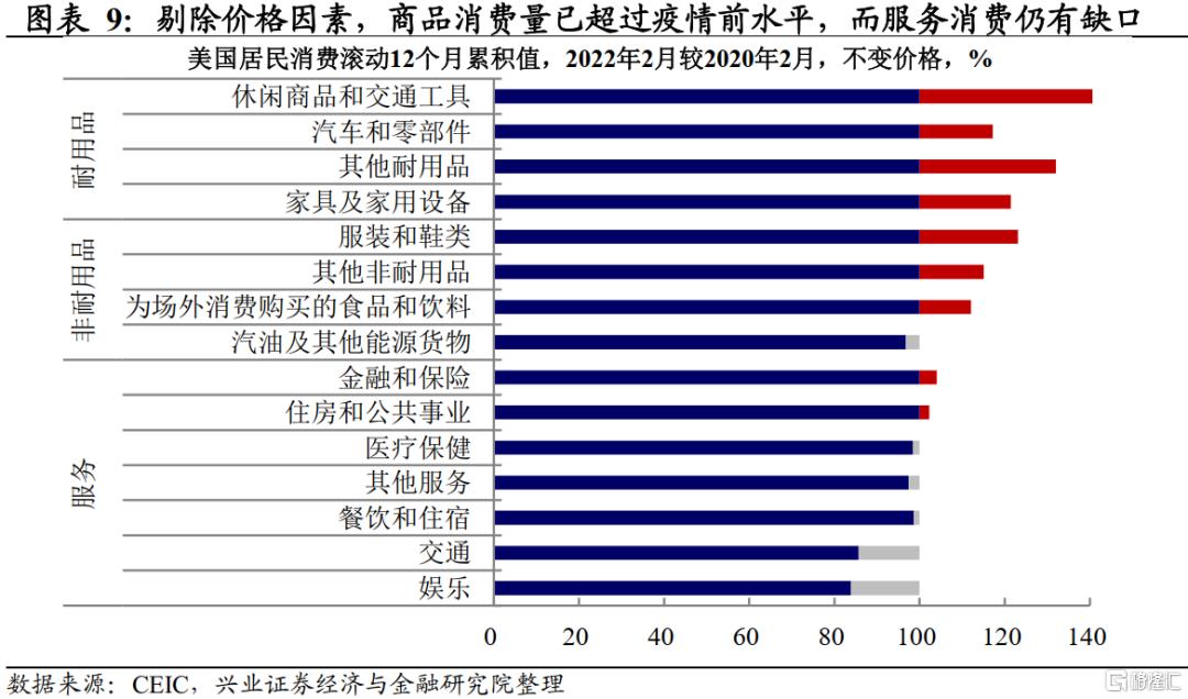 往后看,商品小幅预期继续回落,后续消费斜率主要取决于服务。正如我们在2022年海外年报《缝缝补补又一年》中所详细阐述的,从缺口填补来看,美国商品消费已经透支,然而服务消费仍有缺口,随着美国全面放松口罩政策,出行数据,美国消费的支柱将进一步从商品切换到服务,因此,美国消费的韧性将取决于服务消费。