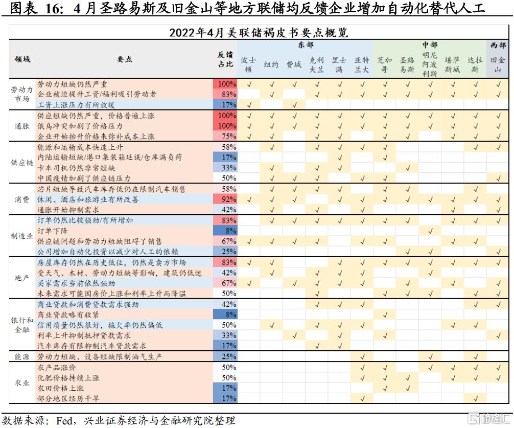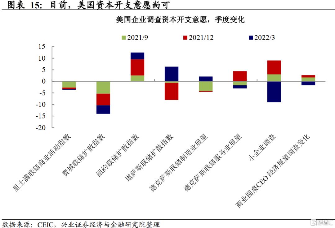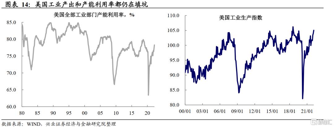 企业目前资本开支意愿尚可,劳动力市场供不应求使得自动化投资增加。企业投资层面,我们看到美国当前制造业订单需求仍然有韧性,工业产出和产能利用率仍在填坑,一季度整体企业资本开支意愿是有所修复的。尤其是,联储4月的褐皮书反映,疫情和刺激支票导致的劳动力市场招不到人的情况,使得部分企业增加了自动化的投资。
