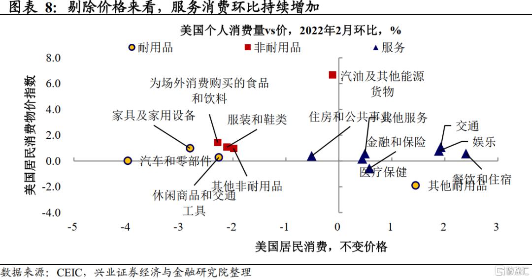 1季度耐用品和服务消费小幅走强,非耐用品消费拉动则转负。拆分来看,1季度耐用品消费环比拉动从0.1%小幅升至0.2%,服务消费环比拉动从0.5%小幅升至0.6%,非耐用品环比拉动则从0%转负为-0.2%。