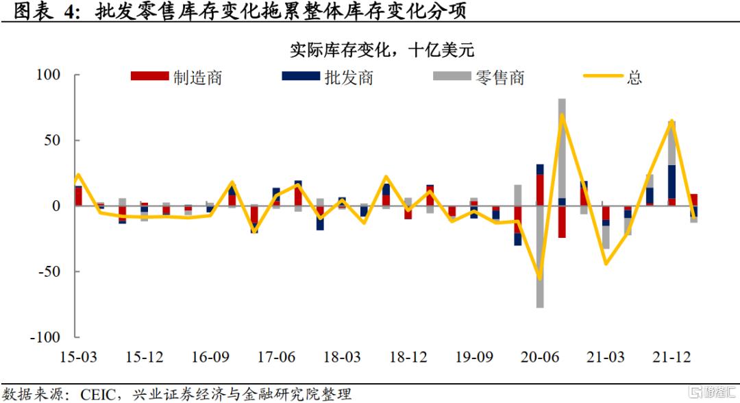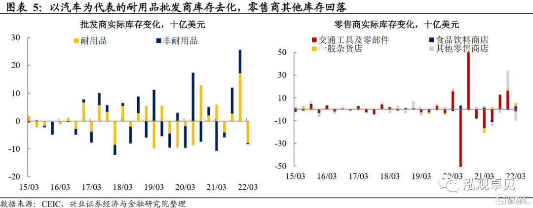 库存变动分项转负,主要受到批发商和零售商库存去化的拖累。拆分库存变化分项来看,美国1季度库存变动减少主要是由于批发商和零售商库存变动减少导致的。批发商库存的去化主要体现在耐用品库存变化的减少;而零售商库存的减少主要体现在交通工具及零部件分项以及其他零售。整体来看,美国1季度库存变化分项的拖累主要是由于以汽车为代表的耐用品去库存导致的,由于持续的芯片等原材料供应链问题,汽车等耐用品生产受到掣肘。