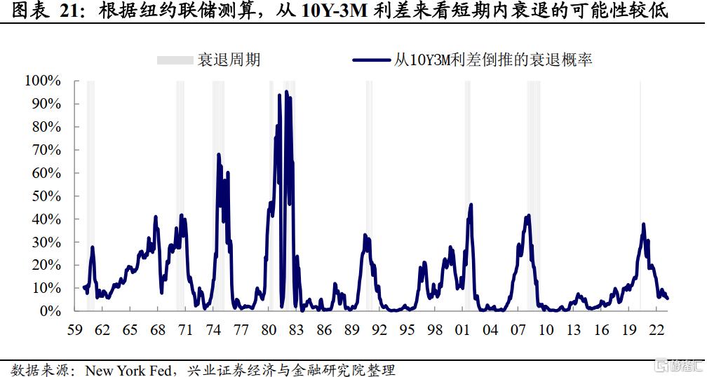 但和此前危机相比,美国私人部门资产负债表较健康,年内衰退言之过早。与2000年和2008年相比,本轮最大的不同在于没有出现金融机构的资产负债表崩塌从而陷入衰退的情况。美国当前居民和企业资产负债表相对比较健康,与此前两轮衰退相比保护垫相对较厚。从联储根据10Y-3M利差测算的衰退概率来看,未来一年内陷入衰退的可能性较低,目前不到10%。