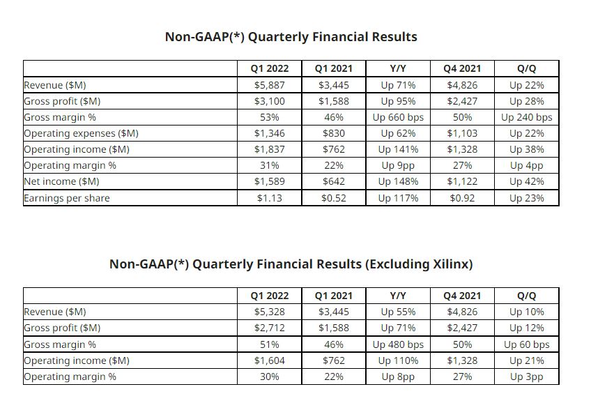 就算不包括赛灵思的部分收入,AMD自身业务在一季度的总营收也创纪录至53亿美元,高于公司官方指引的49亿至51亿美元区间,非GAAP毛利率增至51%,非GAAP营业利润率为30%。