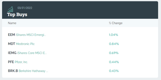 桥水基金一季度建仓做多伯克希尔哈撒韦B类股、Newmont、卡特彼勒、南方铜业公司等;增持iShares MSCI新兴市场ETF、iShares核心MSCI新兴市场ETF、领航富时新兴市场ETF、阿里巴巴ADR、可口可乐、领航富时新兴市场ETF、沃尔玛、百事可乐等547只股票或ETF。