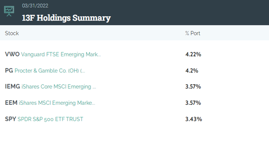 其中,集中度最高的五只标的分别为占比4.22%的Vanguard FTSE Emerging Markets Pacer Swan SOS Fund of Funds ETF|ETF,一季度增加591万股至2270万股(市值10.5亿美元),其次宝洁公司(Procter & Gamble Co.)增持163万股至682万股(市值10.4亿美元)。此外,前五大重仓股/ETF还包括领航富时新兴市场ETF、iShares核心MSCI新兴市场ETF、iShares MSCI新兴市场ETF、以及SPDR标普500ETF信托。