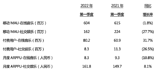 - 第一季度在线音乐付费用户数达到8020万,同比增长31.7%,去年同期为6090万;付费用户数占比13.3%,2021年四季度分别为12.4%、第一季度为9.9%。
