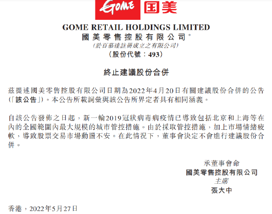 国美零售发布公告称,由于因疫情采取管控措施,加上市场情绪疲软,导致股票交易市场动荡不安。在此情况下,董事会决定不会进行建议股份合并。