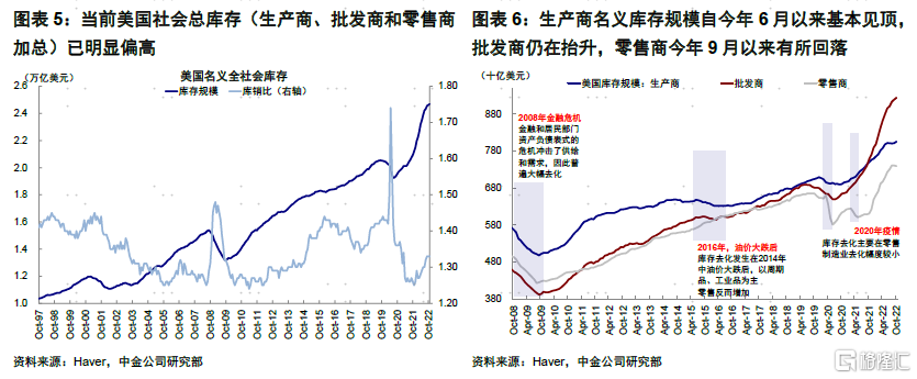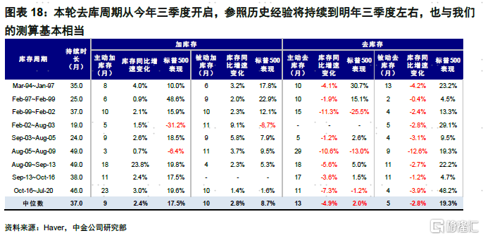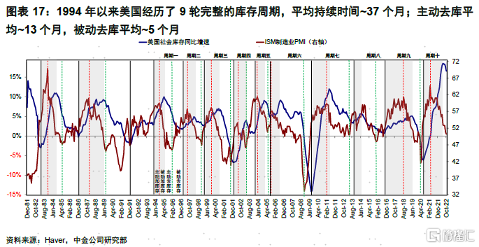 从历史经验看,1994年以来美国共经历了9轮完整库存周期,一个完整周期平均持续37个月,主动去库平均13个月。本轮去库周期从今年三季度开启,参照历史经验将持续到明年三季度左右,也与我们的测算基本相当。不过此轮周期的特殊性在于供需错位更加明显,库存积累较多,短期消费韧性依然强劲,但后续衰退压力是否会带来更大的需求回落也都会影响库存去化的速度。