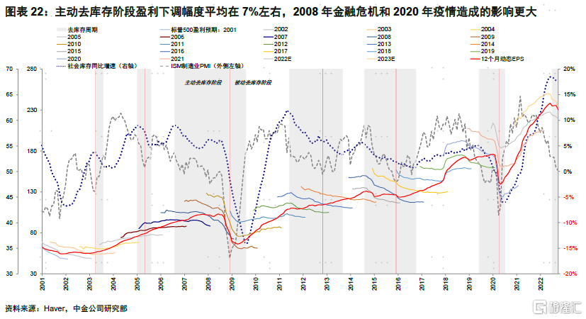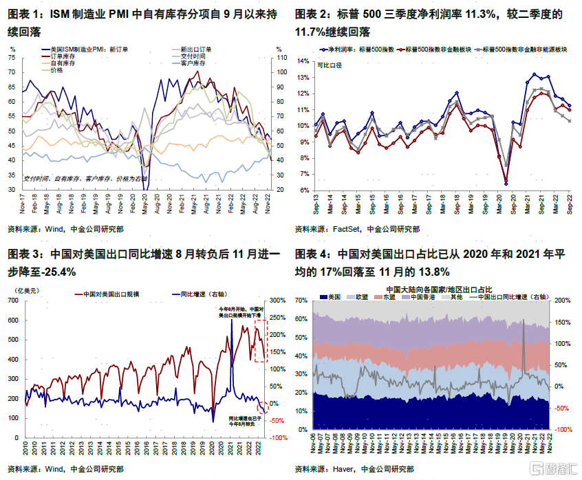 当前美国增长下行态势已较为明显。11月零售环比下降0.6%,创出一年以来最大降幅;11月工业产出环比下滑、产能利用率回落;12月Markit制造与服务业PMI初值分别下滑至46.2和44.4,其中服务业PMI连续6个月位于荣枯线下方,制造业PMI创出2020年5月以来新低。主动去库存即是需求回落的结果,也会反过来通过抑制企业利润率进一步加大增长压力,这在近期已经出现部分端倪。历史经验显示主动去库阶段盈利下调幅度平均为7%。
