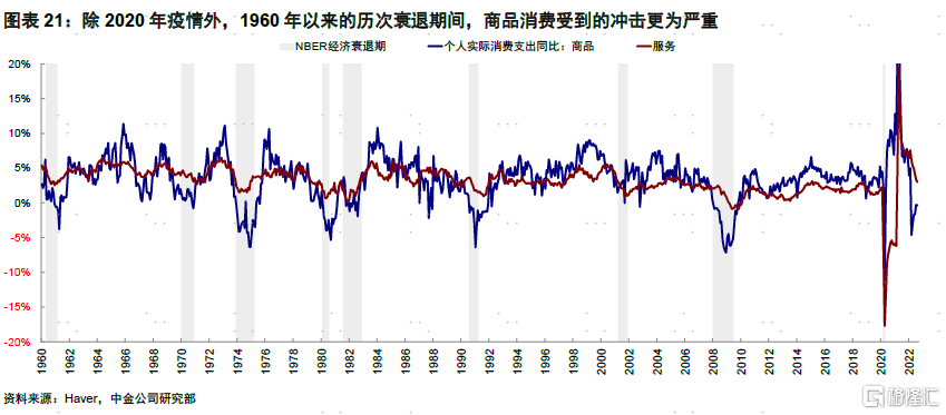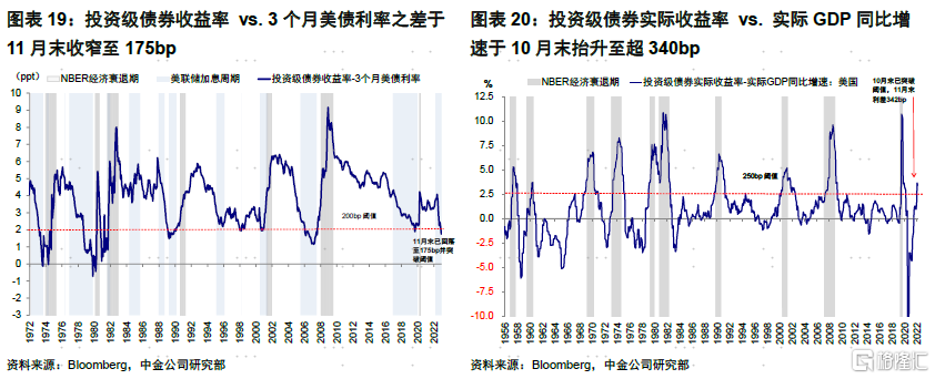 各项指标显示衰退压力或出现在明年上半年。相比滞后且各个维度错位较大的实际数据,金融条件(融资成本 vs. 投资回报率)可以更好的提供预判效果。从以下几个维度看:1)3m10s利差:11月初开始倒挂,倒挂后通常2~3个季度步入衰退;且倒挂越深衰退压力越大;2)企业融资成本与3个月美债利率利差:与3m10s利差类似,投资级债券收益率与3个月美债在11月末收窄至175bp(该指标低于200bp预示衰退压力临近);3)企业实际融资成本与实际回报:投资级债券实际收益率与实际GDP增速,10月末超过 340bp(高于250bp预示衰退压力)。