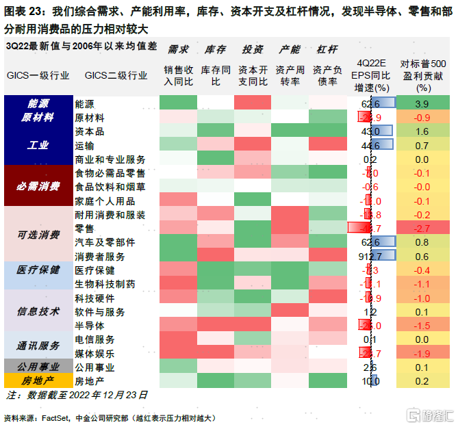 衰退会抑制消费,尤其是商品消费,因此这可能也会反过来延长库存去化时间,加大增长压力。我们综合需求、产能利用率,库存、资本开支及杠杆情况,发现半导体(需求弱、库存与投资高、杠杆高)、零售(需求弱、库存高)和部分耐用消费品的压力相对较大。