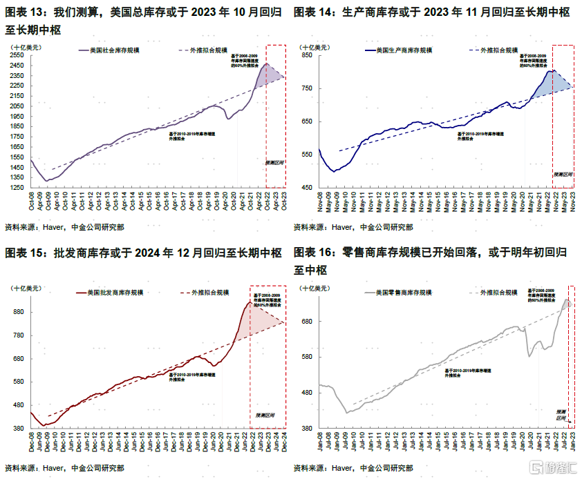 我们以疫情前各环节库存的长期趋势作为中枢,并参考历史上类似阶段的去库存速度作为参照,我们测算整体库存的去化或在2023年三季度末(10月附近)回到长期中枢。不过不同环节差异较大。零售商由于库存规模不高,可能在明年初最先回到中枢水平,生产商库存大概也在明年四季度,但批发商由于库存累计最多,静态在这一速度下完成去库存可能要到2024年底。
