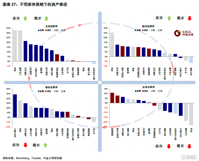 去库阶段债券与成长风格配置价值增加。回顾历史经验,主动去库存阶段,债券表现亮眼,成长风格的纳斯达克领先,美元指数及黄金也有不错的表现。逐步转向被动去库存后,由于需求好转导致库存不足,企业盈利开始改善,因此股票成为该阶段表现最好的资产,同时风险偏好抬升推升高收益债,原油、工业金属等大宗商品逐渐修复,美元指数走弱,国债表现落后。综合库存周期下的资产轮动经验及美联储后续政策的可能路径,我们判断当前国债利率筑顶并在一季度美联储停止加息后打开更大下行空间、二季度后增长压力和宽松预期推动实际利率进一步下行。