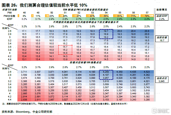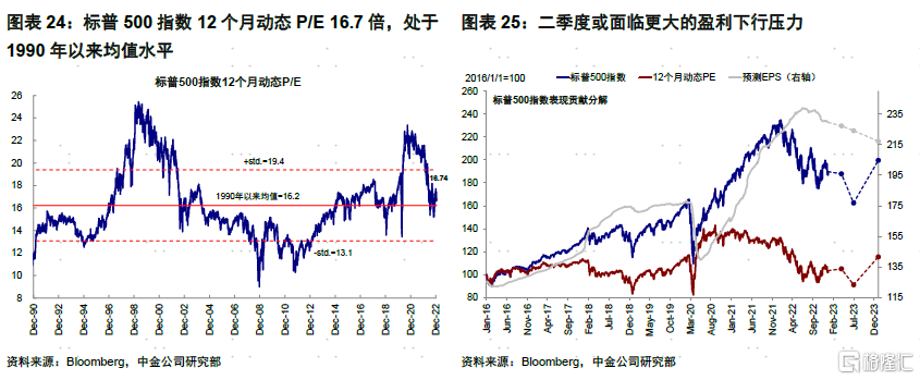 去库存对企业利润率的挤压及后续衰退风险都意味着美股分子端的压力将逐步显现。我们测算,2023年标普500盈利增速或在-5%左右,较当前5%的市场一致预期还有10个百分点的下调空间。当前,美股估值并不算低。标普500指数16.7倍的动态估值与历史平均水平相当,主要也是基于未来通胀将快速回落和美联储紧缩逐步退出的预期。我们也持这一观点,但认为政策退出可能要分阶段兑现,这意味着明年增长压力最大的时候(二季度左右),市场在分子和分母端逻辑切换的过程中可能无法实现一帆风顺式的“空中加油”,或需要通过波动来倒逼宽松预期以实现美债实际利率的进一步下行和市场分母端逻辑的兑现,这是我们在年度展望中提出美国欲扬或需先抑的主要原因(标普500合理估值15倍,较当前低~10%)。在这一过程中,由于腾挪窗口较窄,更大的增长压力和更慢的通胀和政策回落速度都可能放大这一压力。不过,我们与市场较悲观观点不同之处在于我们认为后续通胀回落和政策转向在经过一定波动后,能够重新提振美股特别是成长股表现。