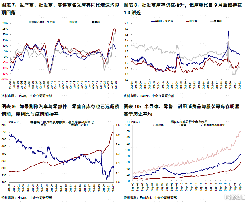 宏观层面,美国已进入主动去库存阶段;渠道库存明显高于长期趋势,零售库存开始下降。1)美国社会总库存(生产商、批发商和零售商加和)规模均超过疫情前水平,实际值(截至9月)还是名义值(截至10月)均如此;总库存同比增速6月后见顶回落,库销比近几个月基本维持在1.3附近(vs. 2019年平均水平1.42),说明销售需求暂时维持韧性,还未导致库销比明显走高。2)分环节看,批发商库存明显高于长期趋势且仍在抬升,表明库存压力主要集中在渠道。零售商库存要好于渠道,规模与库销比9月开始回落。不过看似健康的零售商库存存在显著结构差异,如果剔除汽车与零部件(库销比仅为1992年以来5.4%分位),零售商库存也已远超疫情前,库销比与疫情前持平(1.15 vs. 疫情前1.18)。