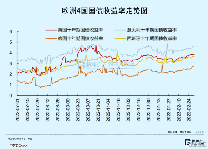 美债6个月、1年期、2年期、5年期、10年期收益率基本都攀升2007年以来的高位水平。除了美债,欧债近期也纷纷被大幅抛售,多国国债收益率也攀升到了2011年,乃至2007年的水平。如此之高的利率水平,且存在进一步攀升的可能,对于全球风险资产、庞大债务规模以及脆弱的经济都会有一定威胁。