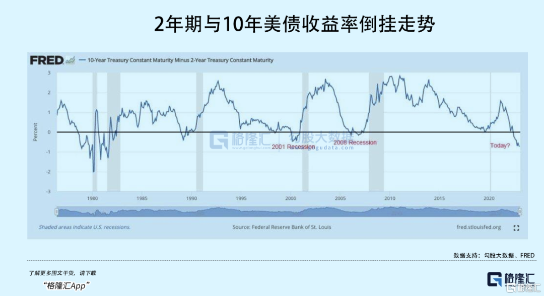 一般而言,如此严重倒挂,往往暗示着严重的经济衰退或经济危机会接踵而至。要知道,历史上,自从1990年以来,两者倒挂过28次,其22次均准确预测了衰退的到来。
