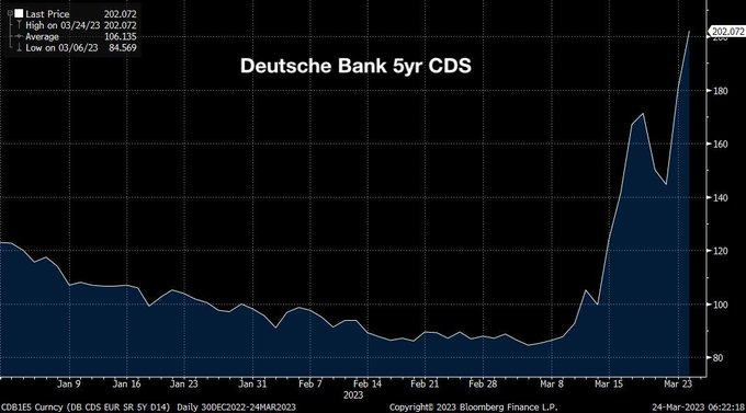 德银的五年期CDS从两周前的不到100个基点一度飙升至上周五的逾200个基点,市场解读认为,继三家美国银行倒闭和瑞信爆雷后,这只德国银行巨头可能是下一家面临压力的金融机构。