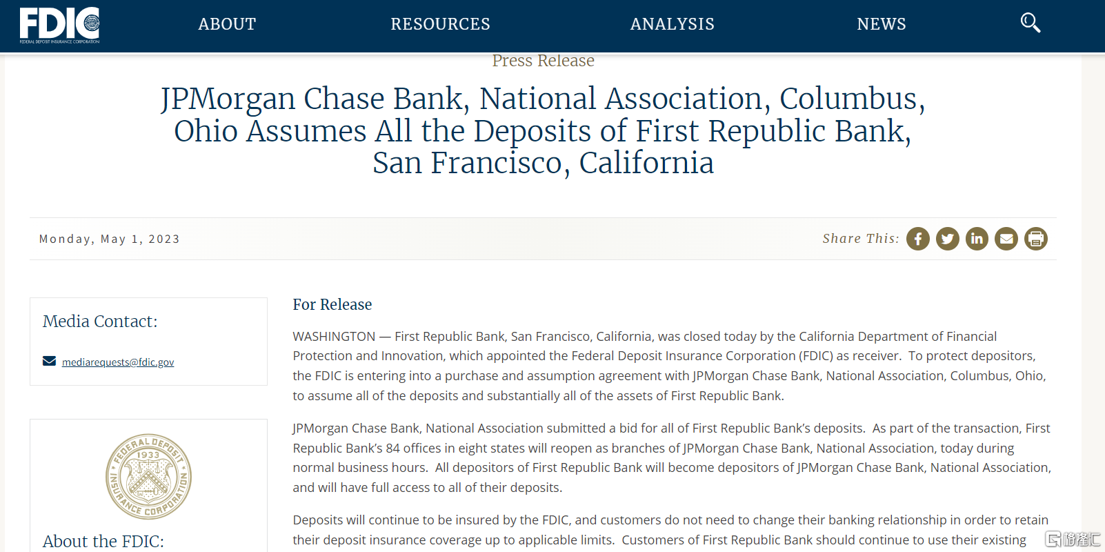 当地时间5 月 1 日,加州金融保护与创新部表示,指定美国联邦存款保险公司(Federal Deposit Insurance Corporation)接管第一共和银行,然后FDIC接受了摩根大通 (JPMorgan Chase Bank, National Association) 对该银行资产的收购要约。