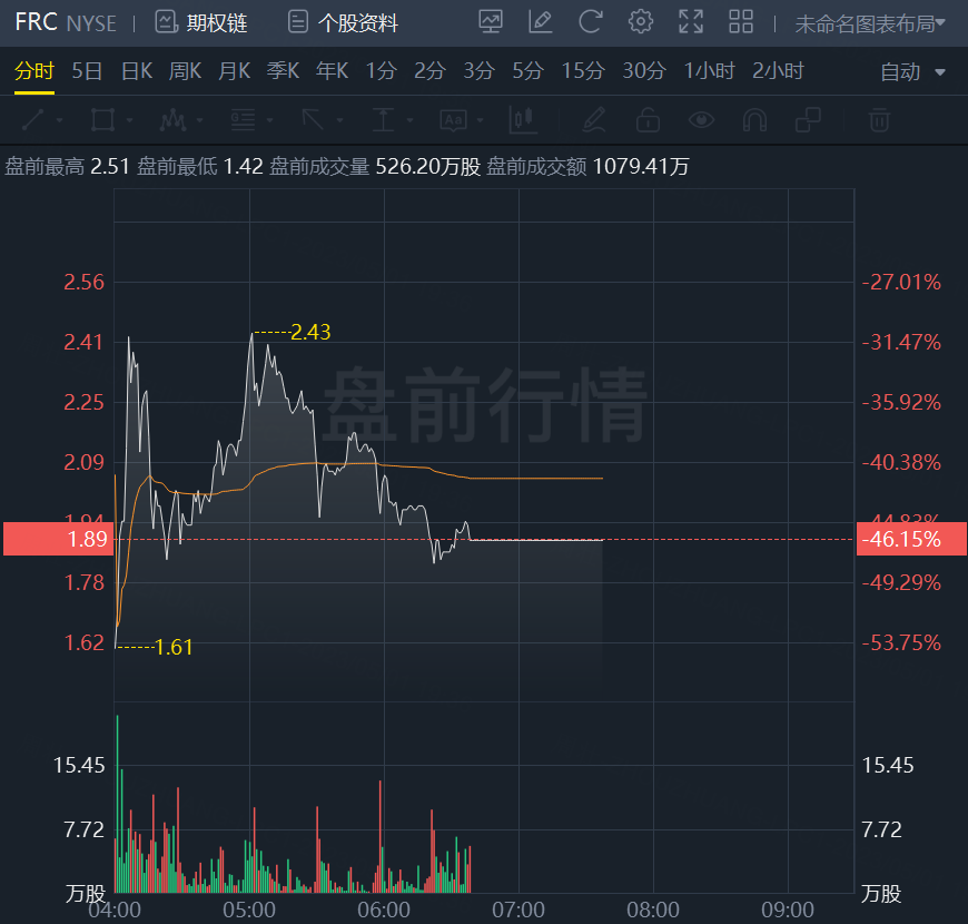 截止发稿,第一共和银行(FRC)盘前停牌,跌近46%;摩根大通(JPM)涨超3%,总市值为4039亿美元(约合人民币2.8万亿元)。