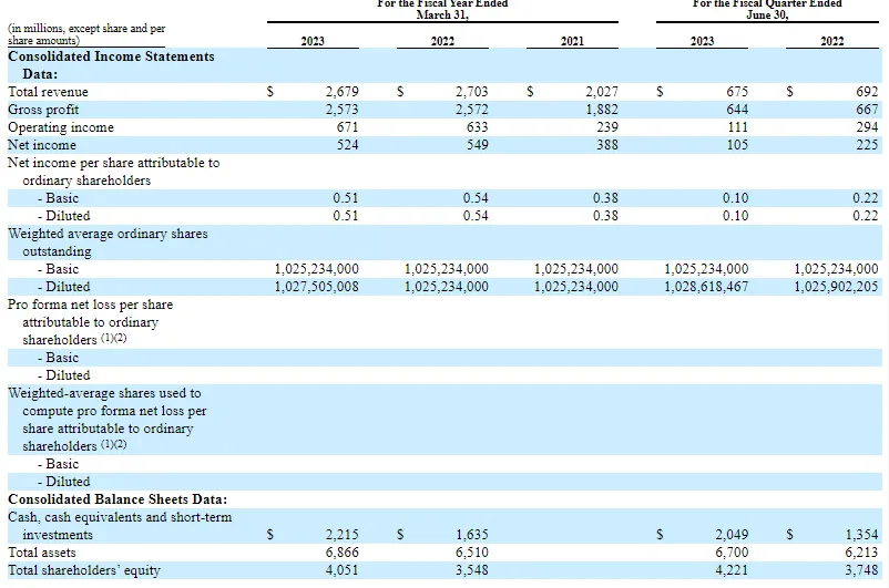 --截至2023年6月30日的第一财季,Arm总营收为6.75亿美元,低于去年同期的6.92亿美元。