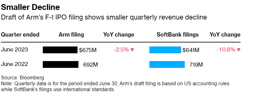 IPO申请草案显示,Arm上一财年的营收下降了约1%,并且截至6月30日的季度营收同比下降2.5%。持有Arm股份的软银正在推动最高达700亿美元的IPO,近期市场仍担心芯片过剩趋势未实质性缓解,加之全球芯片股估值普遍下行、Arm业绩下滑,这些因素令Arm估值变得复杂化。