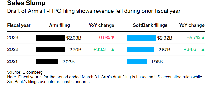 IPO申请草案显示,Arm上一财年的收入下降了约1%,并且截至6月30日的季度销售额同比下降2.5%。持有Arm绝大多数股份的软银曾力求推动最高达700亿美元的IPO,然而,近期市场仍担心芯片过剩趋势未实质性缓解,加之高利率环境下全球芯片股估值普遍下行、Arm业绩下滑,这些因素令Arm估值变得复杂化,分析师普遍预期Arm最终估值约在500-540亿美元之间。