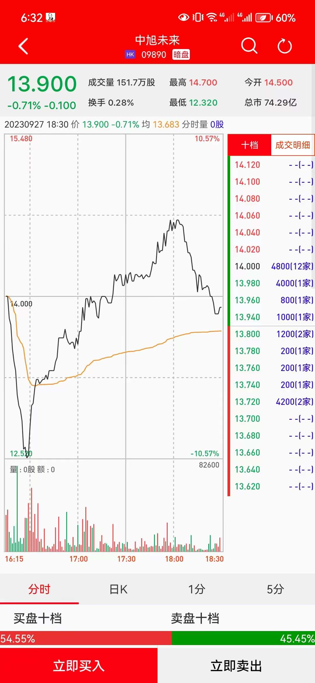 中旭未来(09890)将于9月28日(周四)在香港挂牌。截至收盘,利弗莫尔证券暗盘交易显示报价13.900港元,较招股价14港元跌0.71%。每手200股,不计手续费,每手亏20港元。